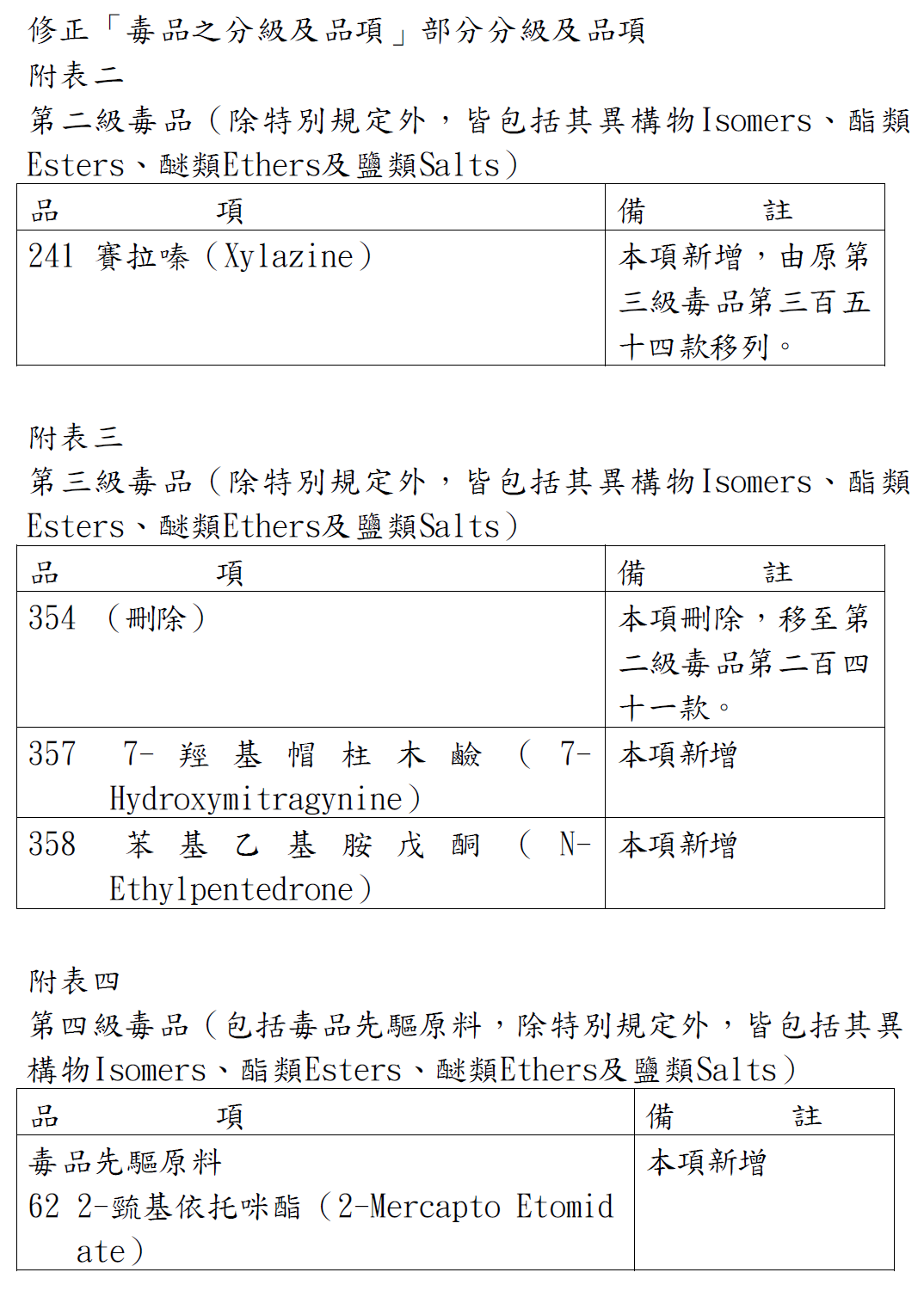 行政院公告修正「毒品之分級及品項」部分分級及品項,115年2月24日生效。